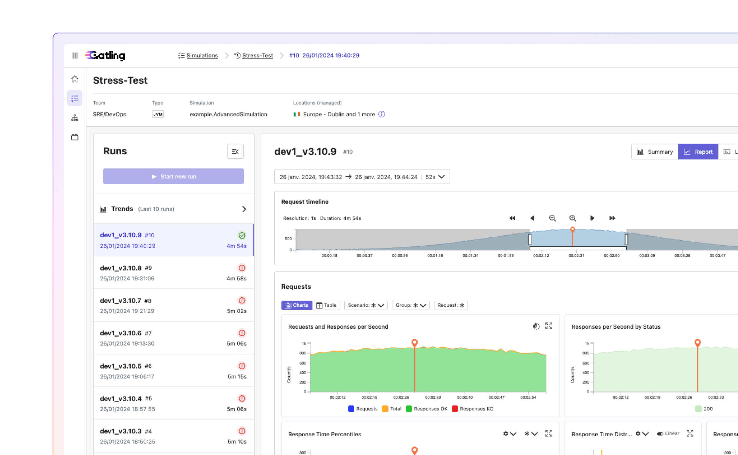 Define response time and error rate targets directly in Gatling Enterprise Edition. Every run returns a compliance score, not a pass/fail, a precise percentage. JMeter has no equivalent. Know exactly how long your system held the line.