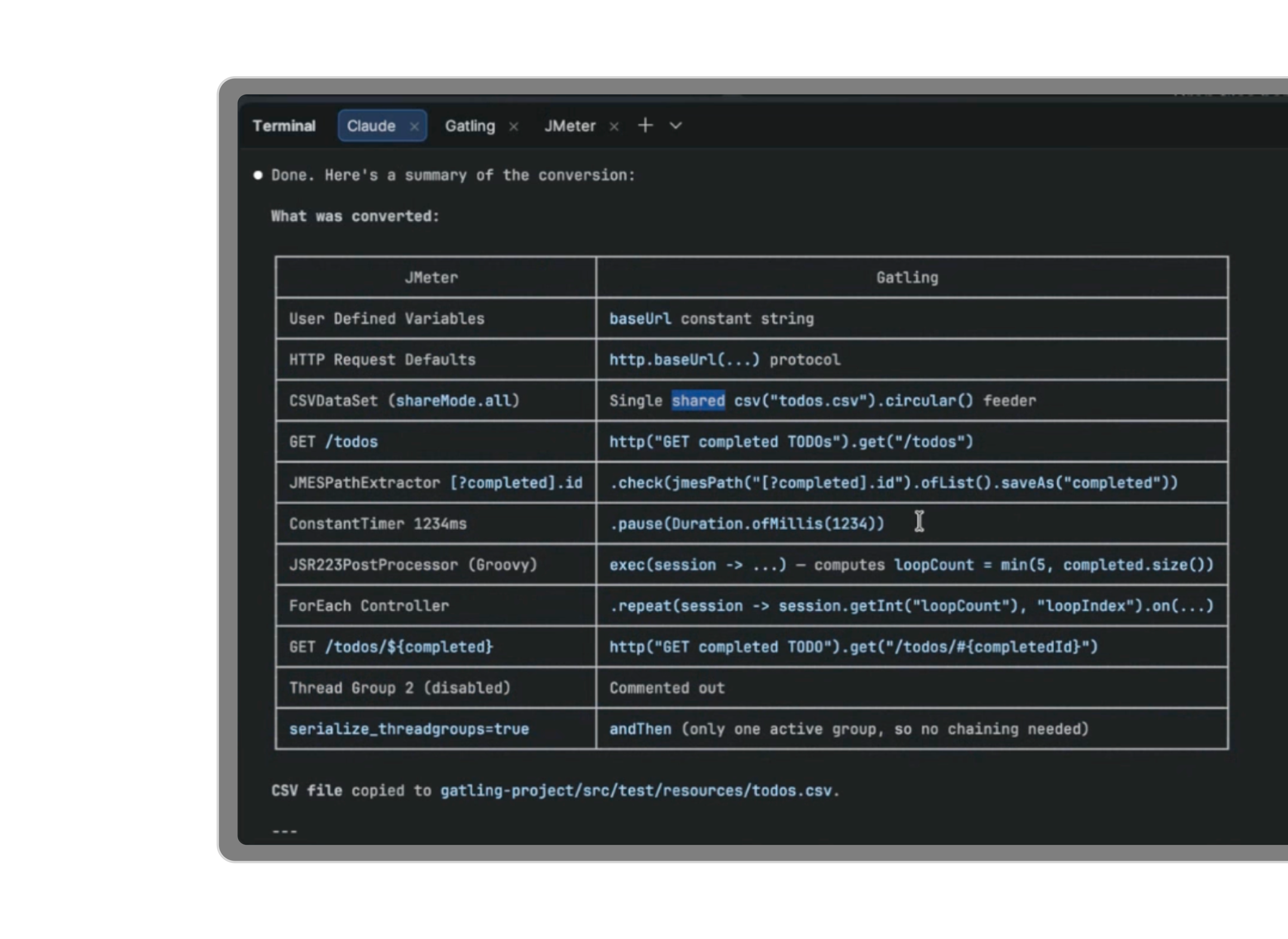 Migrating from JMeter shouldn't mean rebuilding everything from scratch. The Gatling JMeter Converter is an AI skill that reads your existing .jmx files and generates production-ready Gatling simulations, with full mapping of every test element, in the language and build tool your team already uses.