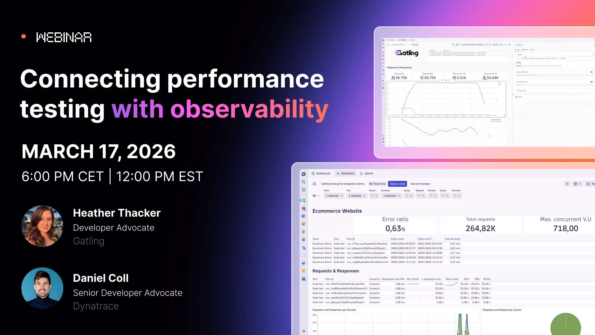 In this joint webinar with Dynatrace, we'll walk through how to integrate Gatling Enterprise Edition with Dynatrace by connecting your load test metrics directly to server-side traces, logs, and automated alerting workflows. You'll see how to go from a failed test to a Slack notification without manual intervention.